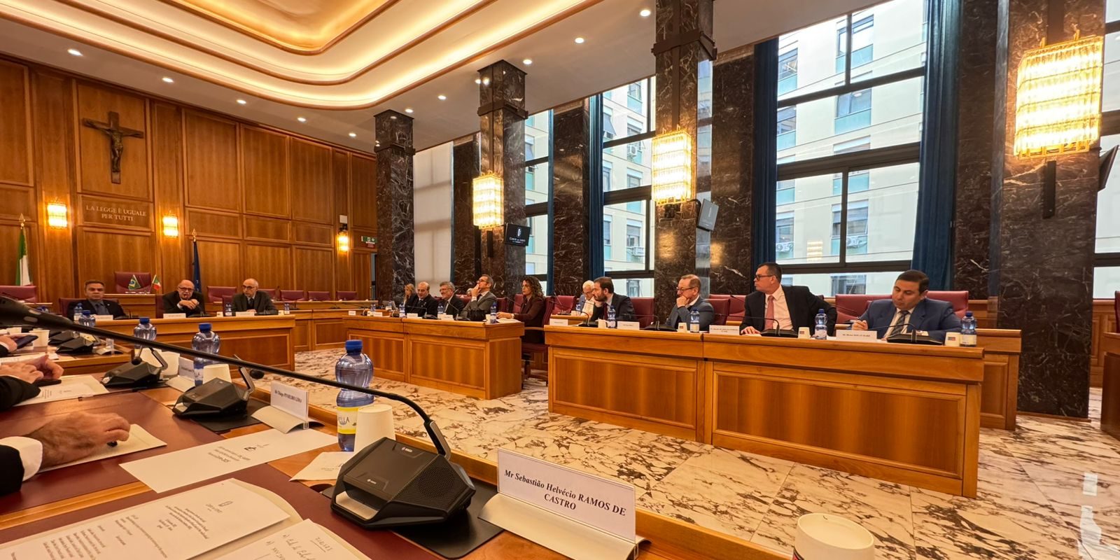 Membros da Diretoria do Instituto Rui Barbosa (IRB), que integram a 1ª Comitiva Brasil–Itália na missão oficial vinculada à Conferência Bilateral Brasil–Itália, participaram, nessa terça-feira (26/11), de uma agenda institucional na Corte dei Conti, órgão máximo de Controle Externo da Itália. O Vice-Presidente de Ensino, Pesquisa e Extensão do IRB, Conselheiro Sebastião Helvecio, representou o Presidente da instituição, Conselheiro Edilberto Pontes, que simultaneamente cumpria agenda oficial na abertura da XXXIV Assembleia Geral da Organização Latino-Americana e do Caribe de Entidades Fiscalizadoras Superiores (OLACEFS), em Fortaleza-CE.