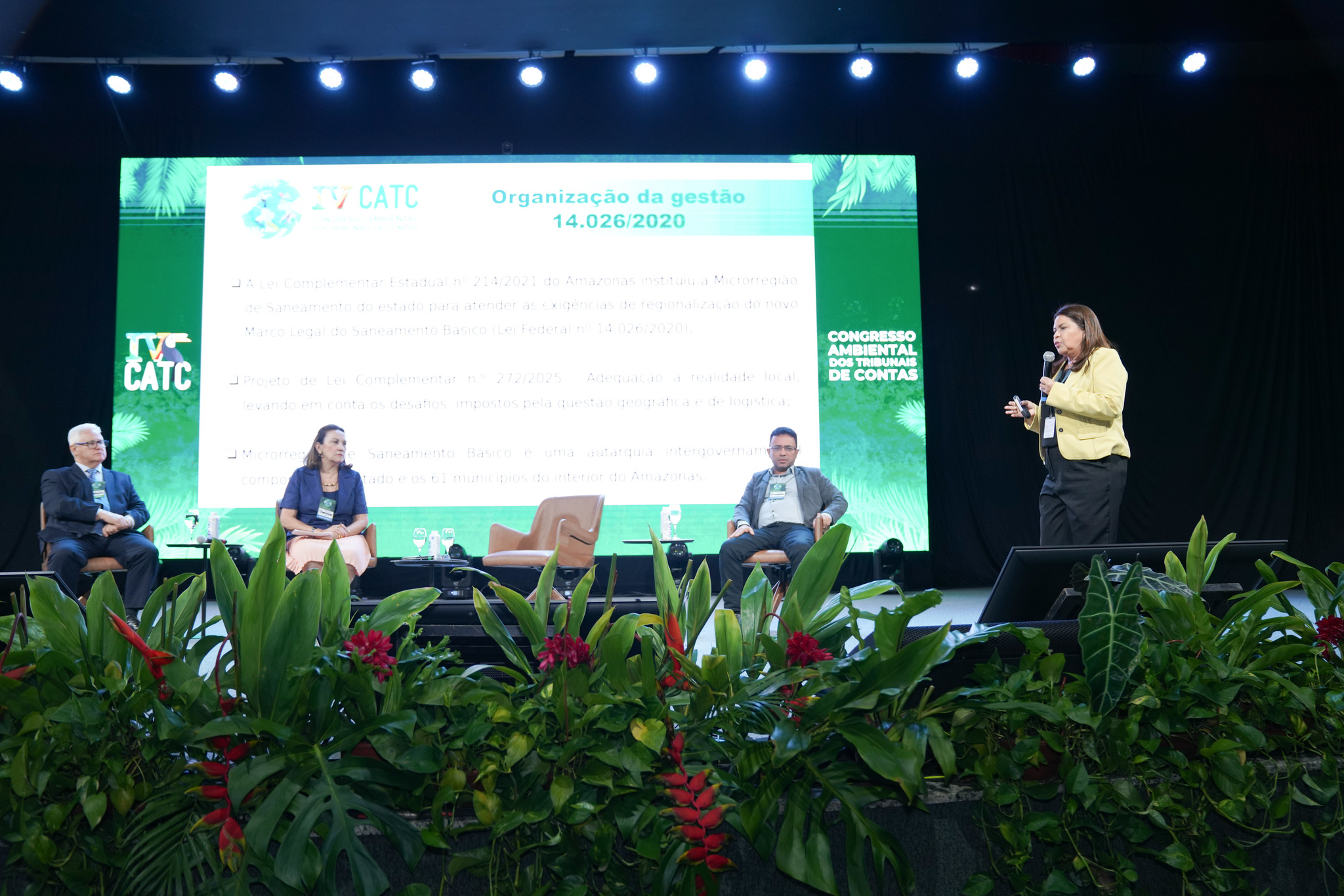 O segundo dia de programação do IV Congresso Ambiental dos Tribunais de Contas (CATC), realizado nessa quinta-feira (23/10), foi marcado por intensos debates sobre resíduos sólidos, saneamento básico e governança ambiental. Os membros da Diretoria do Instituto Rui Barbosa (IRB), Conselheiros Júlio Pinheiro, Presidente do Comitê Técnico de Meio Ambiente e Sustentabilidade e Coordenador-Geral da Escola de Contas Públicas do Tribunal de Contas do Estado do Amazonas (TCE-AM); e Cilene Lago Salomão, Ouvidora do Tribunal de Contas do Estado de Roraima (TCE-RR), tiveram participação de destaque nas discussões, mediando painéis que reforçaram o papel estratégico dos Tribunais de Contas na indução de Políticas Públicas sustentáveis.