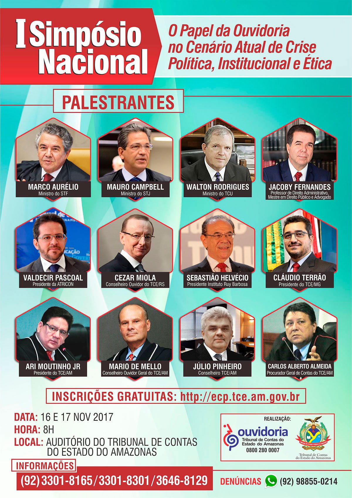 O Tribunal de Contas do Amazonas (TCE-AM) sediará, nos dias 16 e 17 de novembro, a primeira edição nacional do Simpósio sobre o Papel da Ouvidoria no Cenário Atual de Crise Política, Institucional e Ética pela qual atravessa o país. O evento terá a participação de representantes de Ouvidorias de todo o país, além grandes nomes do cenário jurídico e de órgãos públicos do Estado e dos municípios.